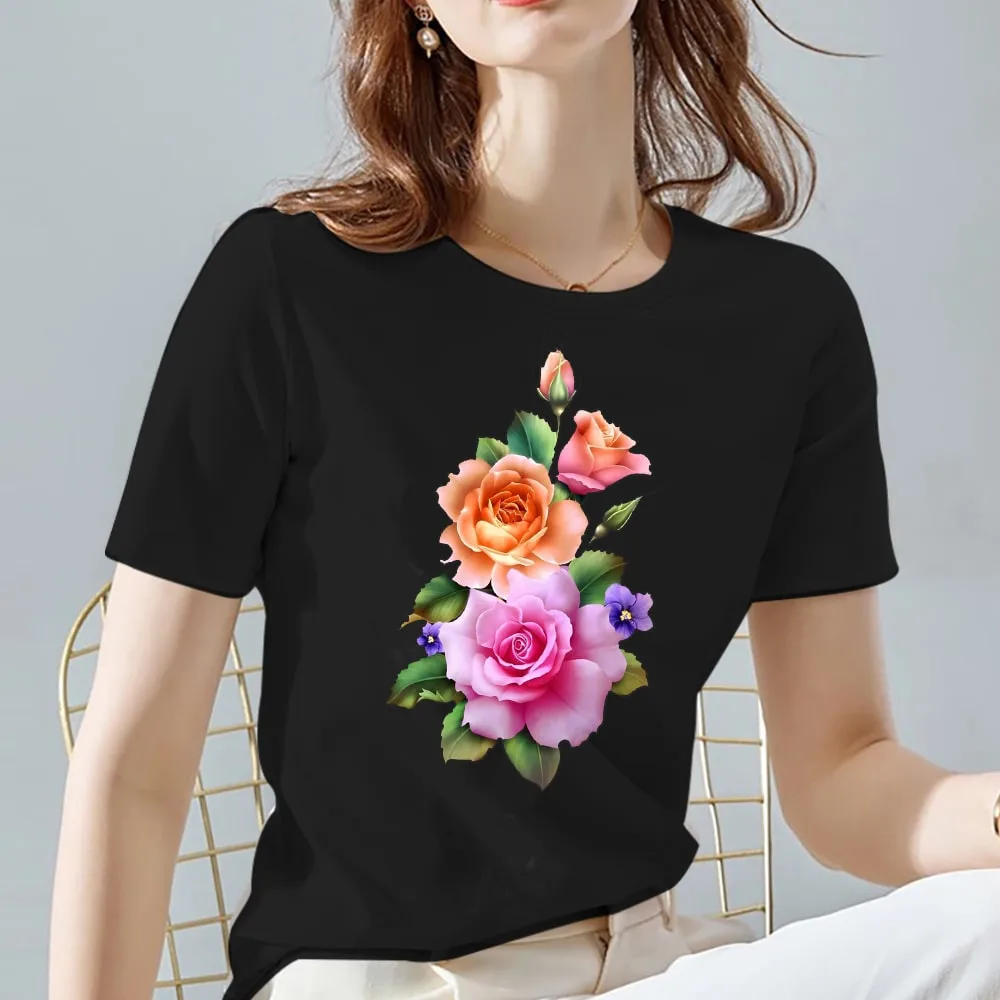 Черна тениска с къс ръкав със цветя в ярки, изкрящи цветове. Изработват се с технология за трансферен печат, така че изображенията запазват цветовете си ярки за дълго време без избледняване и напукване. Тениските които предлагаме са от 100% памук, мека и приятна на допир материя. Дамските размери са леко вталени с по-изрязано деколте. Уни-секс моделите са прави , с деколте по врата. Направете своя избор спряко вашите мерки и бъдете неотразима с нашите нови модели..